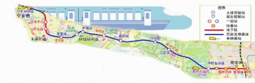 线路长约37.804公里,以高架敷设为主(占比约76%,长约28.832公里)、地下敷设为辅(占比约20%,长约7.54公里),共设站13座。其中高架站8座(含土建预留站1座),为宁乡高铁站、发展路站、华强路站、新阳路站、光明村站、白箬铺站、黄桥大道西站、中联智慧城站。地下站5座,为行政中心站、一环北路站、枫林西路站、雷锋镇站、长庆站。另外,规划预留车站2座。