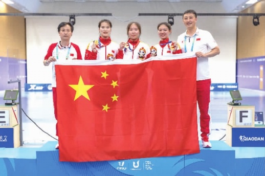 8月1日,在成都大运会射击项目女子25米手枪团体决赛中,湖南衡阳妹子王珂怡(右二)与中国队队友熊亚瑄(左二)、林雅茜(中)以1735环的成绩,夺得金牌,这是湖南大学生运动员在本届运动会上拿下的首金。此前,由王珂怡、林雅茜和张绮组成的中国队还夺得了一枚女子10米气手枪团体银牌。 图为颁奖仪式结束后与教练合影。
