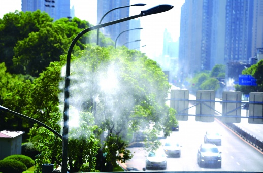 8月3日,长沙县特立路,路灯杆上新安装的高压喷淋降尘系统正喷出水雾。今年来,该县在星沙大道、开元路、特立路等5条主干道分路段的路灯上安装了46套高压喷淋降尘系统。系统开启作业时,可形成水雾墙,对改善环境空气质量、减少路面扬尘及车辆氮氧化物的排放和喷淋沿线绿植起到有效作用。