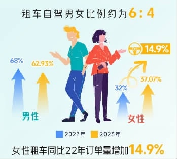 有趣的是,报告显示,今年暑假租车自驾男女用户比例为6:4,女性租车订单占比近四成。随着女性驾驶者逐渐增多、女性出游自主性不断提升,暑期女性租车订单量同比增长14.9%,占比提升五个百分点。