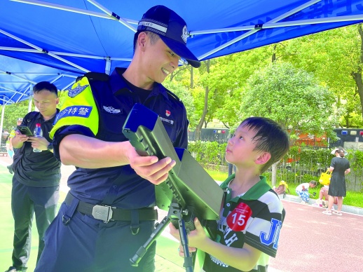 “汪汪队”上演扑击“嫌疑人”、“超级飞侠”从天而降……8月10日上午,长沙公安特巡警举行“筑梦未来 特警同行”警营开放活动,300余名小朋友在家长的带领下,走进长沙市特巡警支队,零距离接触特种警用装备,感受特巡警的硬核本领。图为特巡警与小朋友互动,展示无人机反制枪(上)和79冲锋枪(下)。