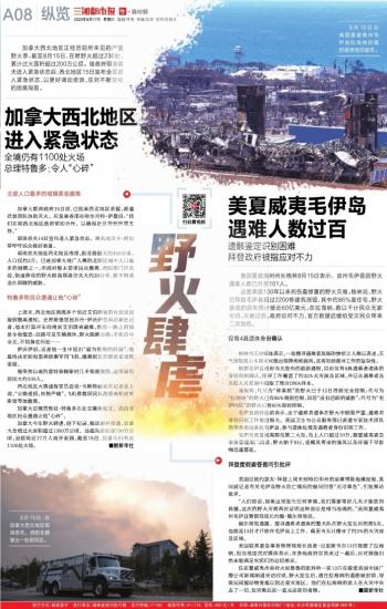 加拿大今年野火肆虐,创下纪录。据法新社报道,加拿大全境过火面积超过1350万公顷,远超先前纪录730万公顷,迫使将近17万人离开家园。截至15日,加拿大仍有近1100处火场。■据新华社