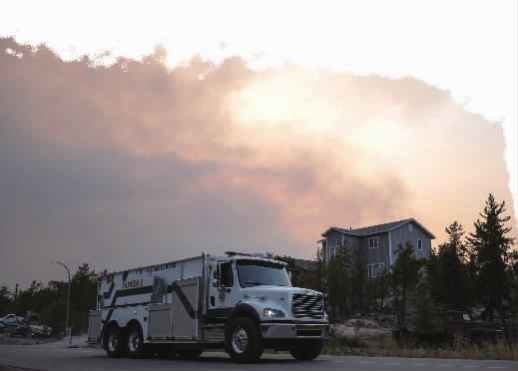 8月15日,在加拿大西北地区耶洛奈夫,消防车辆驶出一处居民区。