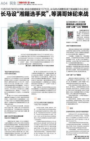 2023长沙马拉松报名通道于9月6日下午5时关闭。6日上午,三湘都市报记者从2023长沙马拉松赛事组委会获悉,2023长沙马拉松将于10月29日上午7时30分,在贺龙体育中心东广场旁鸣枪起跑。届时,将有2.6万名跑友奔跑在山水洲城,共赏“一江两岸”。据悉,今年长马组委会将奖金总额提高至137万元,还专设“湘籍选手奖”,等满哥妹砣来跑。
