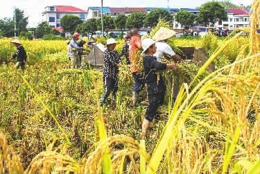 下图:9月17日,浏阳市淳口镇山田村的巨型稻开始收割,平均稻高超过2米,每亩产量预计在750公斤左右。