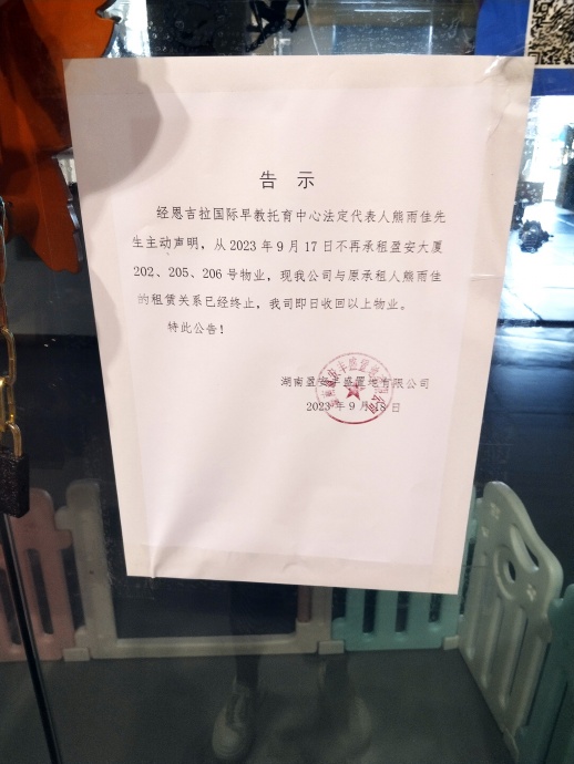 9月19日,三湘都市报记者来到位于长沙市开福区洪山路盈安大厦2楼的恩吉拉国际早教,机构大门紧闭,玻璃大门上贴了一则物业发出的告示,注明:经机构法人主动声明,从2023年9月17日起不再承租,租赁关系终止,9月18日起收回物业。
