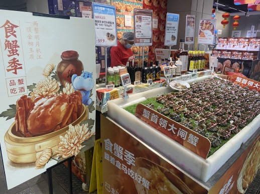 在盒马鲜生华创国际广场店,店内上新“食蟹记”活动。大通湖大闸蟹、蟹首领大闸蟹被整齐地摆放在水产区的显眼处,经过的顾客们大多都会挑上几只。“今年的蟹价很‘美丽’,大通湖大闸蟹6只装价格是99元,比去年同期便宜不少。很多顾客都会买点回去尝鲜!”工作人员李女士笑着对记者说,“阳澄湖大闸蟹预计会在国庆后上市,如果要追求更好的口感,可以到时再来店内购买。”