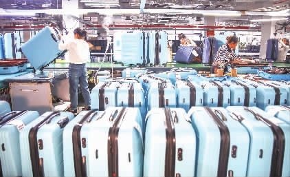 10月9日,蓝山县皮具箱包科技产业园揽胜科技有限公司,工人在赶制出口海外的箱包。近年,该县不断壮大皮具箱包玩具外贸产业集群,助力企业增订单、拓市场。目前,全县已落地皮具箱包玩具企业162家。