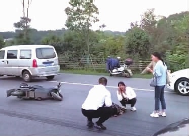 “我要回去看一下,不放心。”杨涛心想,该路段为城区通往乡镇主干道,往来大型货车很多,“倒地的伤者很容易进入货车视野盲区,发生二次事故。”杨涛将车调头停在对向车道路旁,迅速跑步来到事故现场。