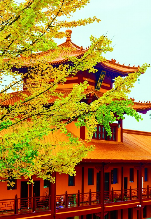 洗心禅寺位于湖南长沙市望城区,寺院建筑群集南北风格于一体,红墙金瓦,翘角飞檐。每到深秋时节,迎着晴朗的天气,金黄的银杏叶、明黄的墙壁和阳光相映成趣,吸引着众多市民前来打卡拍照。