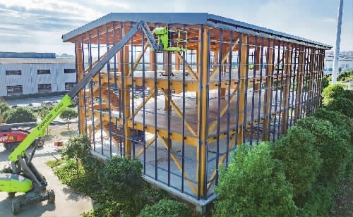 11月7日,桃江县桃江高新技术产业开发区,建设中的竹科研实验楼。该建筑共三层,采用21根全竹主体立柱,其主体梁柱、室内家具、室外装饰全面应用竹材产品。建成后,将成为全国首栋最大全竹结构装配式单体建筑。