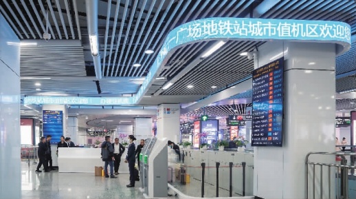 11月10日,长沙五一广场地铁站,工作人员为旅客办理值机手续。当天,长沙机场五一广场地铁站城市值机区已完成场地建设和设备安装,进入实测运行阶段,将于11月16日正式运营,让旅客开启徒手出行轻松之旅。