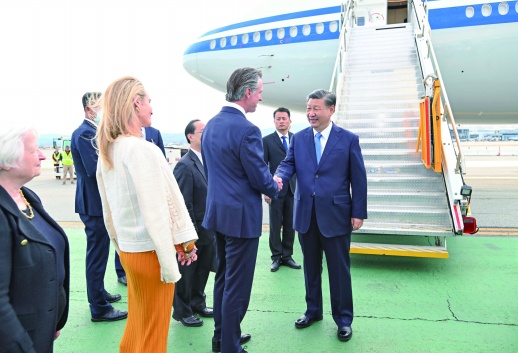 习近平乘坐专机抵达旧金山国际机场时,受到美国加利福尼亚州州长纽森、财政部长耶伦等美方代表热情迎接。