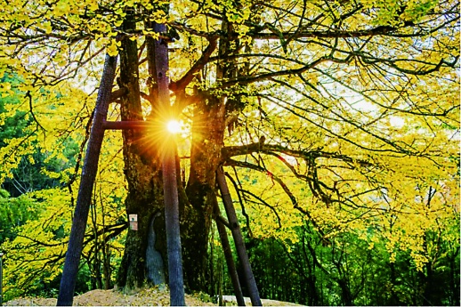 这棵银杏树长在一处山坡上,高大的树体、优美的姿态,远远就能看到。在阳光的普照下,光芒四射,流金溢彩,如一柄金色华盖,又如一名身披“黄金甲”的战士。手机随手一拍就是大片,每一帧都能拿来当作壁纸。