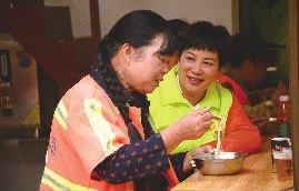 “打扫了一早上的路,真的有点饿了。吃一顿热腾腾的早餐,真舒服。”围坐在餐桌前,环卫工人们有说有笑。