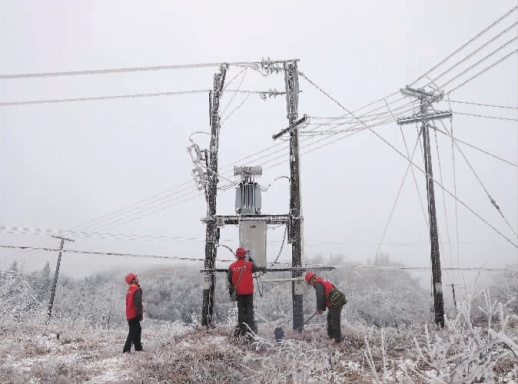 12月16日,国网常德供电公司壶瓶山供电所东方红(电骡子)共产党员服务队队员对10千伏果峰线北山支线进行巡视,检查防冰拉线,清理通道树竹。