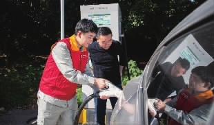 在雁城服务区,从广东返回老家常德的陈先生在工作人员的帮助下很快充好电后,为国网人点赞。