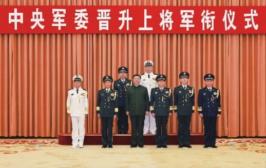 晋衔仪式在嘹亮的军歌声中结束。随后,习近平等领导同志同晋升上将军衔的军官合影。
