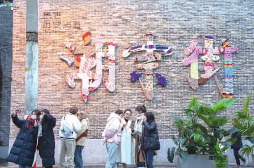1月2日,长沙市开福区潮宗街历史文化街区,市民和游客在打卡拍照。近日,潮宗街以“温暖”为主题,巧用毛线作为主要元素,对潮宗街网红打卡墙进行更换和设计。这些毛线被巧妙地编织在一起,不仅增添了潮宗街的色彩,更为这条古老的街道注入了新的活力。