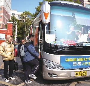 三湘都市报1月12日讯 12日11时许,一辆贴有“湖南机场暖冬行动,免费大巴进校园”标识的机场巴士驶入湖南大学天马学生公寓,陆续有学生提着行李走上大巴车。