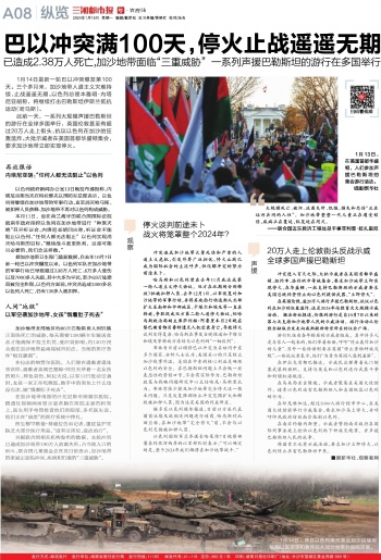 1月14日是新一轮巴以冲突爆发第100天。三个多月来,加沙地带人道主义灾难持续,止战遥遥无期。以色列总理本雅明·内塔尼亚胡称,将继续打击巴勒斯坦伊斯兰抵抗运动(哈马斯)。
