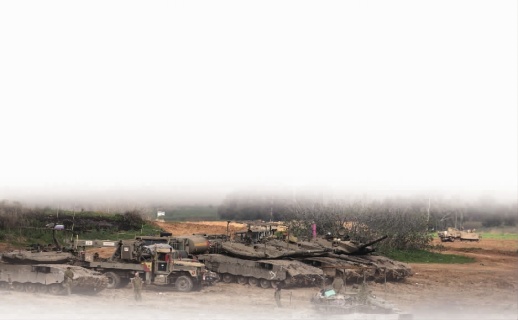 1月14日,停在以色列南部靠近加沙边境地区的以军坦克和轰炸后从加沙地带升起的浓烟。