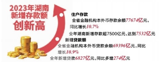 2023年末,全省金融机构本外币存款余额77674亿元,同比增长10.7%,高于全国1.1个百分点。全年湖南新增存款超7500亿元,达到7532亿元,同比多增281亿元,新增额创历年新高。