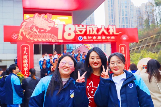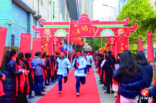 在高考倒计时100天之际,湖南多所中学举办高考百日誓师活动和成人礼仪式,通过各种方式为高三学子加油鼓劲。(上图)长沙麓山外国语实验中学,印有祝福语的可乐罐叠成高塔,讲台已然变成加油助威的阵地。(中图)长沙市周南中学高三学生穿过成人门后和家长合影留念。(下图)花垣一中,高三学子头戴红丝带,一起跑向成功门。 学校供图