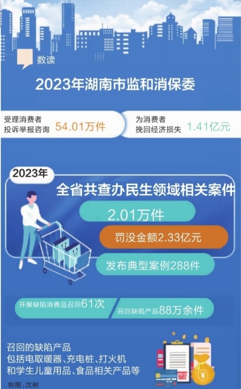 三湘都市报3月13日讯 3月13日,省政府新闻办举行湖南2024年“3·15”国际消费者权益日新闻发布会。省市场监督管理局一级巡视员秦继红在会上介绍,2024年,湖南市场监管执法将突出“保安全”“反欺诈”两大主题,持续推进民生领域“铁拳”行动,严厉打击制售假劣燃气灶具、电动自行车、儿童玩具、家居家装材料,在宣称镇痛安睡等功能食品中非法添加药品及其衍生物,违法生产使用小型锅炉,在涉及人身财产安全的产品质量、食品安全检验检测活动中出具不实或虚假检验检测报告,加油机计量作弊,利用不公平格式条款侵害消费者权益,商标侵权、伪造或冒用地理标志,价格欺诈,虚假违法广告等人民群众反映强烈、社会危害性大、社会舆论关注的重点违法行为,着力防范和化解市场风险,维护好消费者权益。