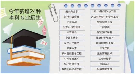 从教育部发布最新版《普通高等学校本科专业目录》中不难看出,此次增设24种新专业,体现了四个方面的人才需求趋势:立足服务国家战略需要,设置大功率半导体科学与工程、生物育种技术等专业;聚焦科学前沿和关键技术领域,深化“四新”建设,设置电子信息材料、智能视觉工程、智能海洋装备等专业;推动中华优秀传统文化创造性转化、创新性发展,设置中国古典学等专业;聚焦服务健康中国战略需求,落实体育强国建设部署,设置健康科学与技术、体育康养、足球运动等专业。