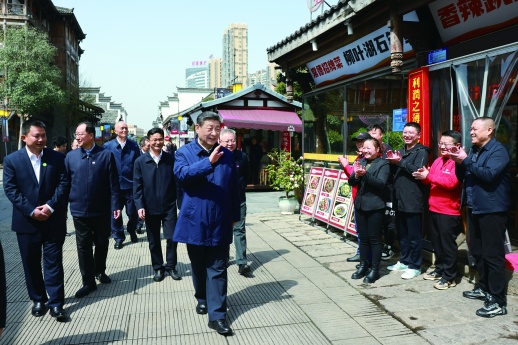 19日,习近平到常德市考察调研。位于沅江江畔的常德河街历史悠久,曾毁于1943年的常德战役。近年来,常德市复原老河街风貌,将此地打造成为历史文化街区。当天上午,习近平来到常德河街,察看各种特色小吃、特产、特色工艺品,同店主和游客亲切交流,并欣赏非物质文化遗产技艺展示,详细了解常德老城街道修复利用、城市规划、水环境综合治理等情况。习近平指出,多姿多彩的地方特色传统文化,共同构成璀璨的中华文明,也助推经济社会发展。常德是有文化传承的地方,这里的丝弦、高腔、号子等要以适当载体传承好利用好,与时俱进发展好。