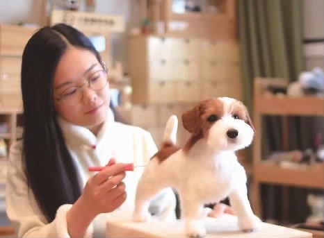 目前,彭立在全网有近20万粉丝,作品还在长城上展览过。闲暇之余,她也在短视频上直播羊毛毡还原宠物的过程,最多实时观看人数达到8000余人;她还会免费教授学员,希望能把这份充满爱的技艺传承下去。