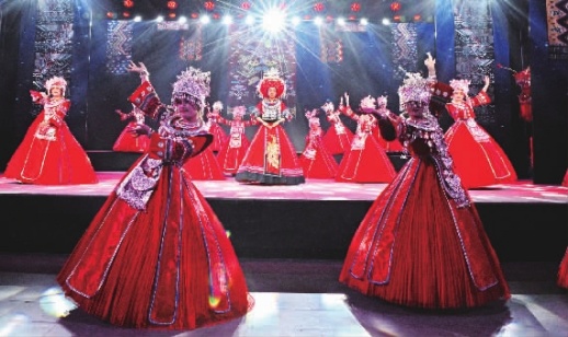 5月4日,吉首市乾州古城,演员在表演非遗秀。“五一”假期,乾州古城推出《湘西乾城非遗秀》,将土家山歌、打溜子、土家织锦技艺等非遗项目与舞美声光电融合,充分展示湘西非物质文化的深厚内涵和独特魅力。