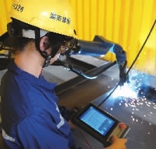 5月8日,株洲董家塅高科园,湖南省工业设备安装有限公司中兴分公司,工人正抢抓工期为岳阳临湘工业园、长沙黄花机场T3航站楼赶制压力容器和桁架。