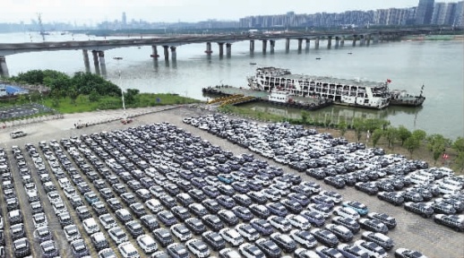 5月20日,长沙新港汽车滚装码头,400余台汽车即将进行滚装装船作业。这些汽车将在岳阳转运,发往沙特、阿联酋等国家和地区。水运具有运价低、能耗低、污染小等优势,滚装运输提升汽车装卸效率,降低物流成本。