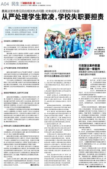 不少未成年人犯罪案件中,学校未能及时发现和干预欺凌、不良交友等问题,导致学生走向犯罪或者被侵害。最高法意见对此明确规定,学校、培训机构等未尽到教育管理职责的,依法判决承担侵权责任,并根据情况发送司法建议。