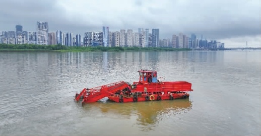 6月17日,湘江长沙风帆广场段,全自动打捞船在清理江面漂浮物。