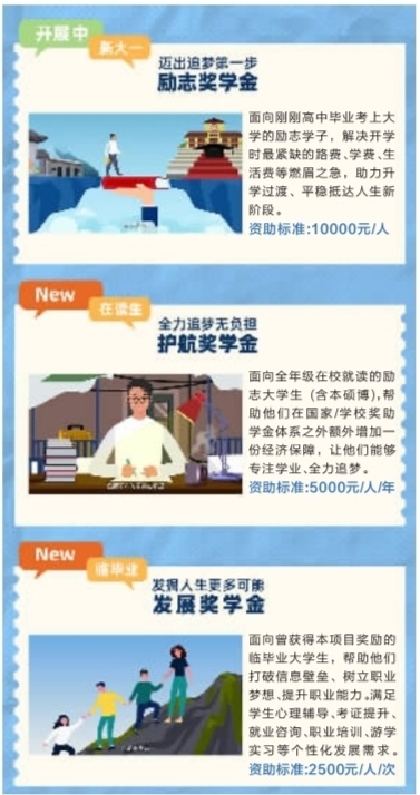 今年夏天,“励志学子追梦计划”升级为“梦想+”大学生助力计划,从“一次性资助”升级为“全学段全方位帮助”,继续为大一励志学子颁发10000元励志奖学金的基础上,新增了护航奖学金(5000元)、发展奖学金(2500元),增加了对在读大学生的持续帮助、临毕业生的自我提升就业帮助等。