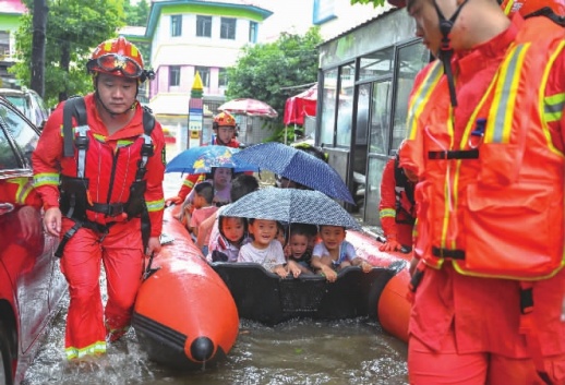 6月24日,长沙突遇强降雨,火车站附近的长沙长铁第一幼儿园内涝严重,积水最深处已达胸口,园内200名幼儿和28名老师被困。“小朋友别怕,消防员叔叔来了!”危急时刻,长沙芙蓉大队湘湖消防救援站迅速反应,紧急出动了3艘冲锋舟展开救援。经过一个半小时的接力,所有人员平安救出。 图/湖南日报全媒体记者 郭立亮