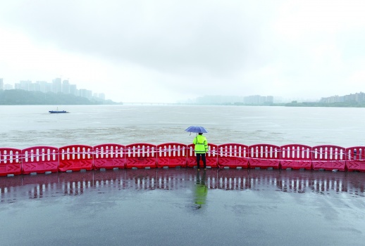 6月27日,橘子洲景区工作人员时刻关注水情变化。当天4时52分,湘江长沙站出现洪峰水位37.14米,超警戒水位1.14米。7时57分水位开始回落,本次洪峰已平稳通过湘江长沙站。省水文水资源勘测中心发布通告,提醒沿河有关单位及公众加强防范,注意避险。