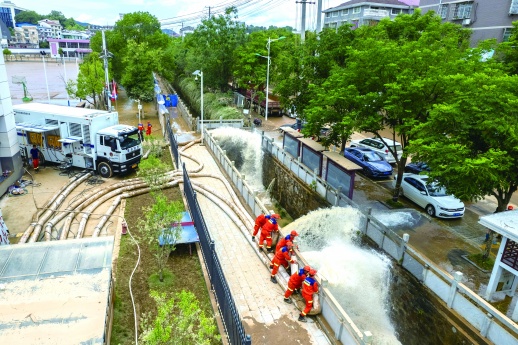 7月3日,在平江县启明中学,国家矿山应急救援重庆队队员在进行排涝工作(无人机照片)。随着洪水消退,当地积极开展灾后清淤、排涝等工作,确保群众出行便利,恢复干净卫生的生活环境。新华社 图