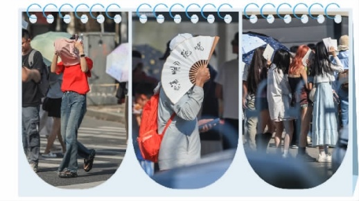 7月9日,湖南博物院,长沙持续高温,游客“花式”遮挡强烈的阳光。