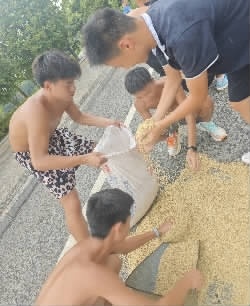 队伍训练到一半时,天空突然下起大雨,恰巧遇到了几位上了年纪的农户奶奶,手忙脚乱地在收晒着的稻谷。