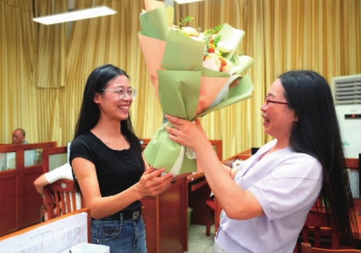 9月9日,浏阳市第一中学,毕业于该校的新进教师彭文雨(左)向自己的老师江资健献花。 在第40个教师节即将来临之际,该校开展“谢师恩”主题活动,通过“老师,我想对你说”“长大后我就成了你”等活动形式,弘扬尊师重教的优良传统,传递浓浓师生情。