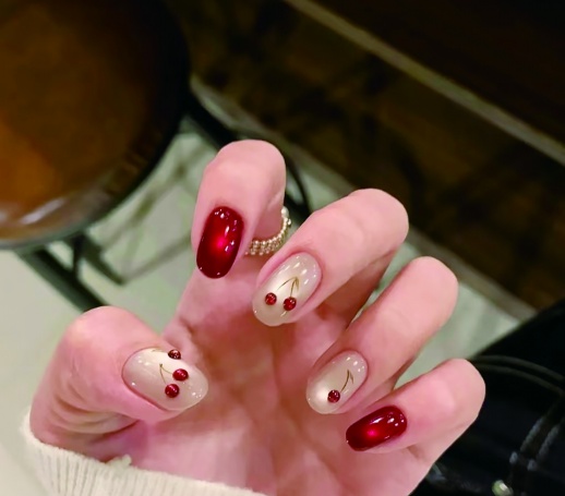 “红色象征着吉祥如意、红红火火,是春节的传统配色,永远都不会过时。”燕子说,鲜亮的山楂红和温柔的车厘子红很受欢迎,而且很多顾客会主动要求增加金色或银色的装饰,让指尖瞬间充满节日氛围。