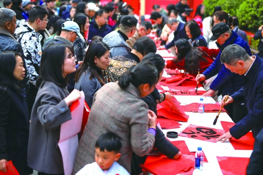 “上联‘风调雨顺年丰稔’,下联‘龙去蛇来岁吉祥’,横批‘国泰民安’。我这是刘晓斌老师的作品。”市民李先生将刚拿到的春联晾在一旁的花坛上,“书法家创作的春联,年味都浓一些,带回家我都不舍得贴门上,要好好保存。”