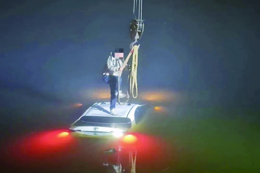 民警陈子威回忆说,到达现场后,他们看到落水车辆已沉入水塘中央,离岸边三四米远,仅车顶露出水面,被困女子在车顶上大声呼救。当事人因受到惊吓而浑身颤抖、体力不支,随时有从车顶跌落水中的危险。