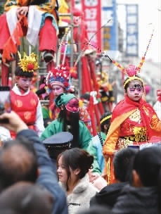 图③:2月11日,汨罗市长乐古镇,“长乐抬阁故事会”在进行巡游,吸引众多游客围观。
