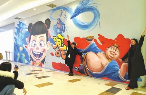 2月21日,长沙市雨花区沙湾公园旁,一处“哪吒”主题涂鸦墙吸引不少市民拍照打卡,墙上绘制的哪吒、敖丙、太乙真人等漫画人物形象栩栩如生,换跃然墙面。