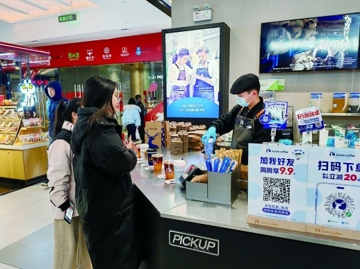 “1月27日,我们上线的新品开心果拿铁每天都卖断货!门店每天要用掉十袋原料,能卖出80多杯,2月中旬就卖断货了。”瑞幸咖啡泊富店店员拿出印着《封神2》的周边海报骄傲地说,“有许多顾客因喜爱‘封神’系列电影慕名前来,还会要求赠送杯套及周边纸袋。价格也很划算,原价22元的联名款咖啡团购仅14.7元。”